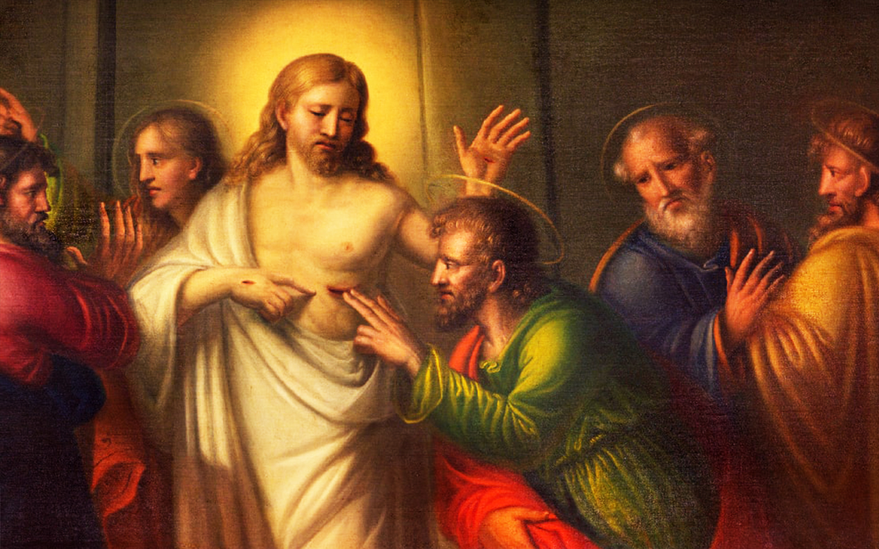 Gesù Cristo crocifisso e risorto, apparendo ai suoi discepoli, mostra loro le mani e il fianco, cioè le ferite della Passione, e pone i fondamenti della sua comunità: la pace, lo Spirito Santo, la gioia, il perdono. Egli li invia a portare al mondo intero il Vangelo della salvezza, l’annuncio della remissione dei peccati